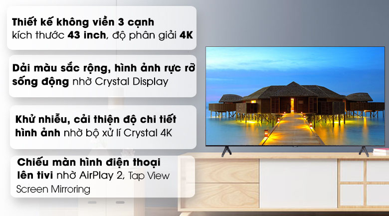 - Thiết kế không viền 3 cạnh sang trọng, kích thước tivi 43 inch. Độ phân giải Ultra HD 4K sắc nét.