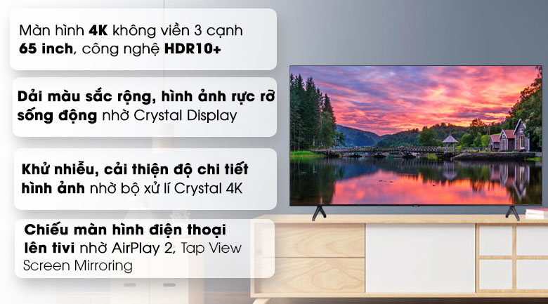 - Công nghệ Crystal Display trên tivi UA65TU7000KXXV mang lại cho bạn những khung hình với dải màu sắc rực rỡ, giúp tối ưu hóa màu sắc hiển thị nhằm mang đến những hình ảnh sống động bất ngờ.