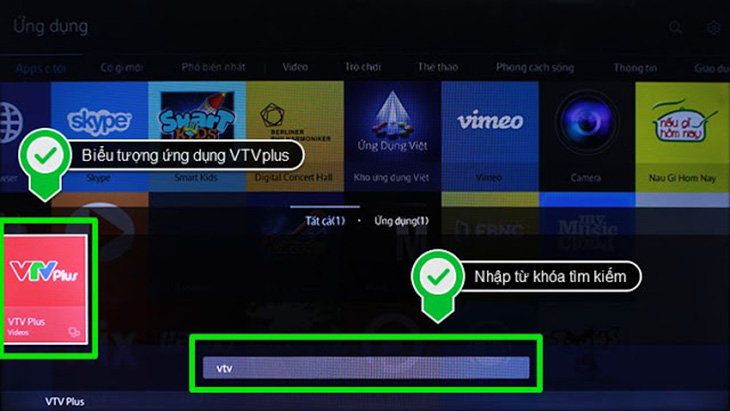 Bước 1: Nhấn nút SMART HUB trên remote và tìm ứng dụng VTVPlus. Nếu trên giao diện không hiển thị thì bạn vào mục tìm kiếm, nhập "vtv".