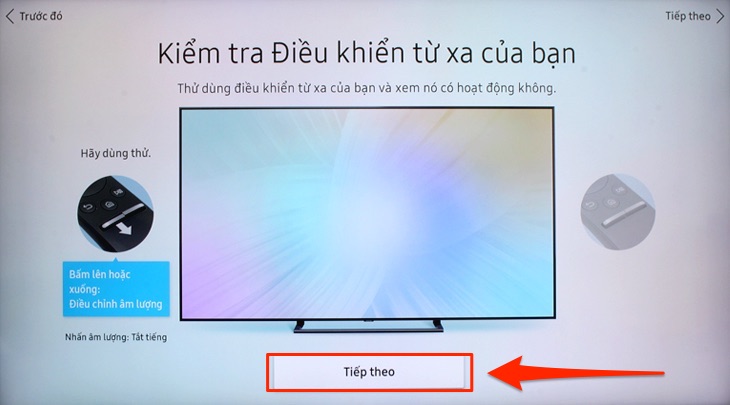 Bước 14: Tivi sẽ hướng dẫn bạn kiểm tra kết nối giữa remote với tivi, bạn có thử bấm di chuyển lên hoặc xuống, tăng - giảm âm lượng. Sau đó bạn chọn Tiếp theo.