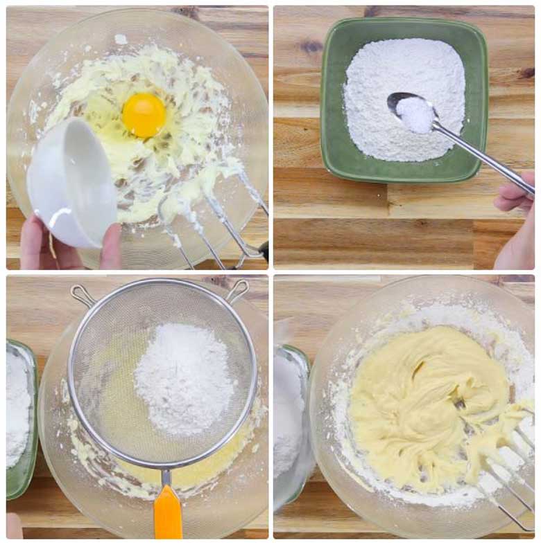 + Chia hỗn hợp khô thành 3 phần. Rây từng phần vào hỗn hợp bơ đường và dùng máy đánh trứng đánh đều với nhau.