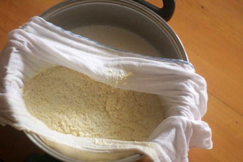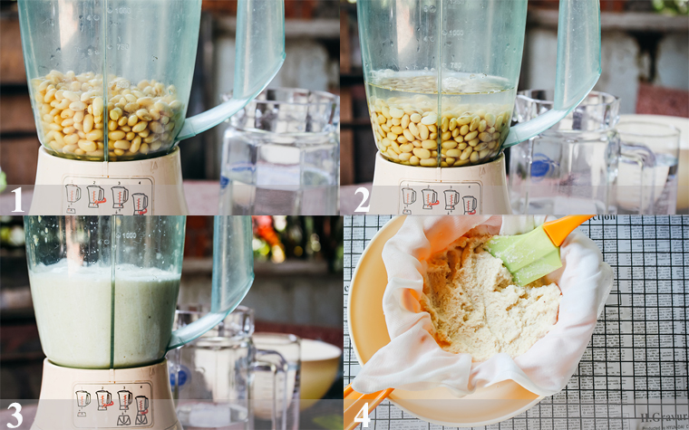 Xay đậu xong, bạn dùng một cái rây và một tấm vải sạch lọc lấy phần sữa đậu nành