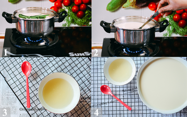 Bước 2: Tiếp theo, bạn cho phần sữa đậu nành vừa lọc ban nãy vào nồi cùng vài cái lá dứa, bắt lên bếp nấu ở lửa vừa. Bạn lưu ý vừa nấu vừa khuấy đều để sữa không bị khét ở dưới đáy nồi. Nấu cho tới khi sữa sôi lên là được.