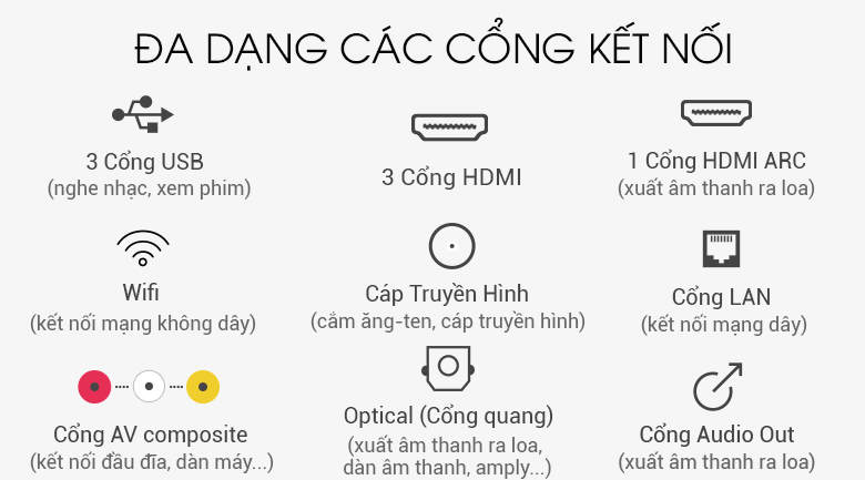 Thông qua các cổng được tích hợp sẵn trên tivi: USB, HDMI, AV, Optical... bạn có thể dễ dàng kết nối tivi với dàn máy, đầu đĩa, USB, laptop, loa để xem phim hấp dẫn hơn. Tuy nhiên sẽ gặp 1 chút rắc rối nếu như bạn sử dụng tivi treo tường vì 1 số cổng kết nối đặt ở phía mặt sau nên khi sử dụng, bạn sẽ rất khó để cắm vào, cách bố trí hiện tại có vẻ sẽ phù hợp hơn cho các bạn đặt tivi trên bàn cố định.