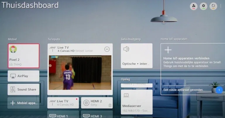 Với trí thông minh nhân tạo độc quyền của LG ThinQ AI thì bạn có thể kết nối và điều khiển các thiết bị điện tử trong gia đình như: tủ lạnh, máy lạnh, máy giặt,... với tivi dễ dàng. Ở bên trái, bạn sẽ tìm thấy các phím tắt để kết nối với các thiết bị thông minh khác, Airplay và tuỳ chọn phát âm thanh từ điện thoại của bạn lên tivi qua Bluetooth.