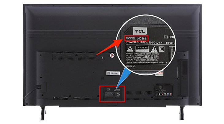 Thông tin tên của tivi TCL được in rõ ràng và chi tiết ngay mặt sau tại dòng "MODEL" của tivi.