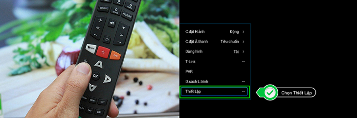 Nhấn nút Menu có biểu tượng hình 3 dấu gạch trên remote và chọn Thiết lập.