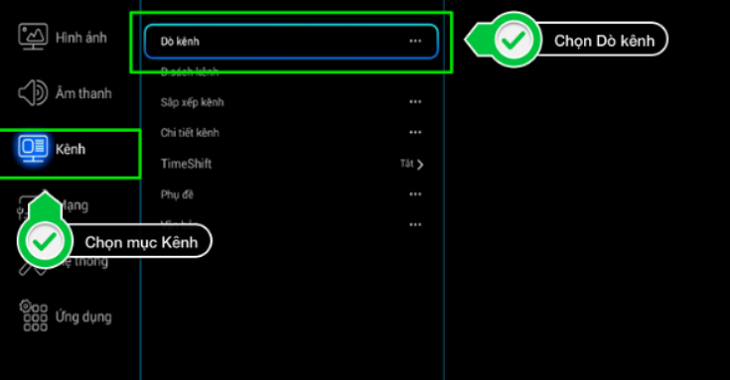 Bước 3: Chọn Kênh >> Chọn Dò kênh