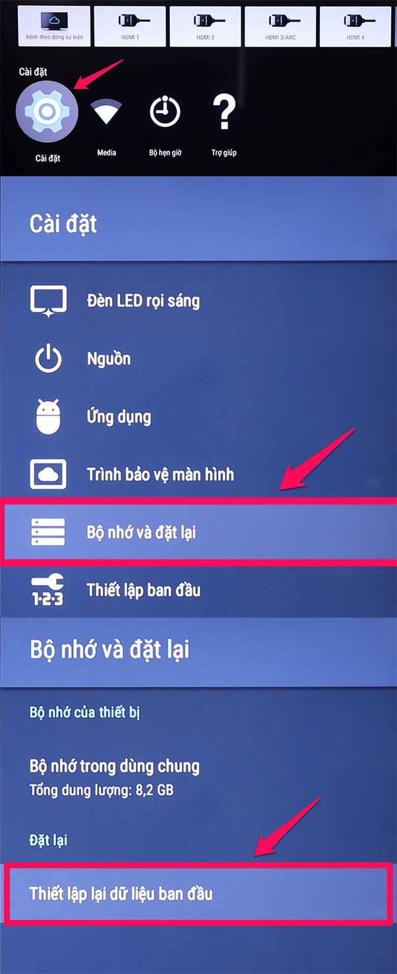Bước 2: Bạn tiếp tục dùng phím mũi tên kéo xuống dưới cùng và chọn “Cài đặt” => Bạn chọn “Bộ nhớ và đặt lại” => Bạn tiếp tục chọn “Thiết lập lại dữ liệu ban đầu”.