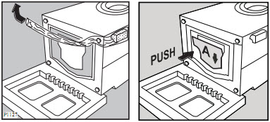 + Bước 4: Cẩn thận gỡ túi nhựa bên phải bằng cách kéo nó về phía trái, sau đó lên phía trên. Lấy nắp đáy của máy từ trong thùng máy ra, đặt bản lề của nó theo mũi tên “A” trong hình và đẩy phần trên của máy để gắn chặt nó lại