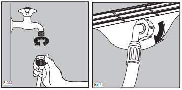 + Đầu kia của ống dẫn nước nối vào máy có thể quay theo bất kì hướng nào. Chỉ việc nới lỏng đầu ráp. Kiểm tra xem nước có bị rò rỉ hay không.