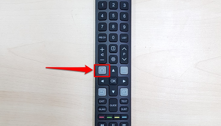 Bước 1: Nhấn vào nút “hình ngôi nhà” trên remote tivi để vào giao diện chính của máy.