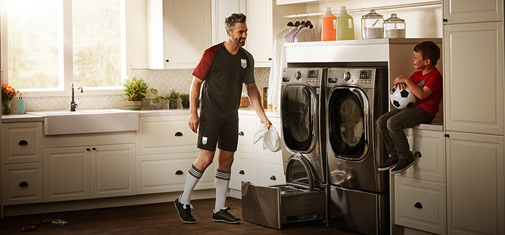 Máy giặt đôi LG biến phần đế trợ lực thành một máy giặt thứ 2, nhờ vậy bạn có thể giặt 2 mẻ đồ khác nhau cùng một lúc. Máy giặt ở trên sẽ đảm nhận phần việc nặng hơn trong khi máy giặt mini thứ 2 sẽ giúp bạn xử lý những trang phục đặc biệt hơn như đồ thể thao hoặc một vài bộ đồ dễ ra màu cần chú ý.