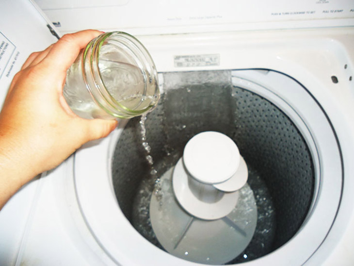 Tiếp đến cho một ít thuốc tẩy vào để loại bỏ các vết bẩn nhanh hơn và nhớ đừng cho quần áo vào cho đến khi máy giặt đã hoàn tất quy trình làm giặt.
