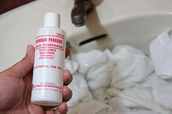 Oxy già là công cụ để tẩy trắng quần áo rất tuyệt vời. Đổ oxy già vào máy giặt, sau đó ngâm đồ từ 20 – 30 phút rồi bắt đầu cho máy chạy. Oxy già không những giúp tẩy trắng quần áo mà còn không để lại mùi như thuốc tẩy.