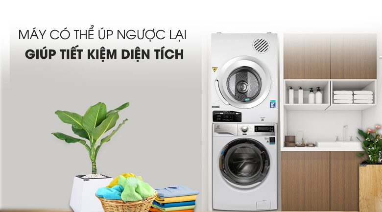 Chính vì vậy, thông thường máy sấy quần áo thông hơi có thể đặt úp ngược lên trên máy giặt nhằm tiết kiệm không gian diện tích cũng như giúp bạn không gặp khó khăn khi điều chỉnh máy nếu chiều cao của bạn "khiêm tốn".