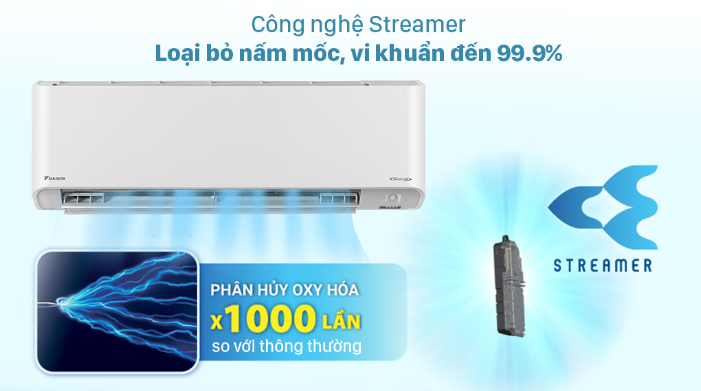 Streamer có khả năng tiêu diệt 99,9% các loại nấm mốc, vi khuẩn. Ngoài khả năng diệt khuẩn, công nghệ này còn giúp dàn tản nhiệt sạch sẽ khi kết hợp với chức năng chống ẩm mốc Mold Proof trên máy.