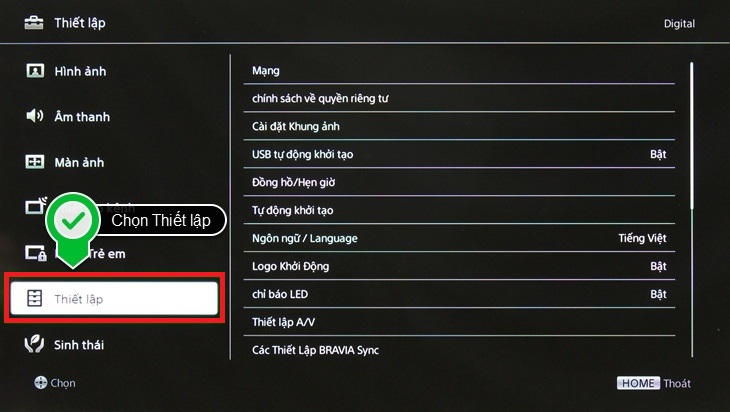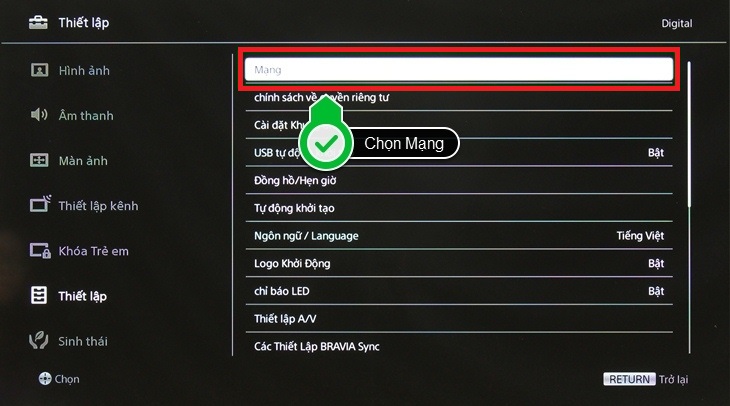 Bước 3: Để kết nối mạng cho tivi bạn vào phần Cài đặt (Settings) > Thiết lập > Mạng.