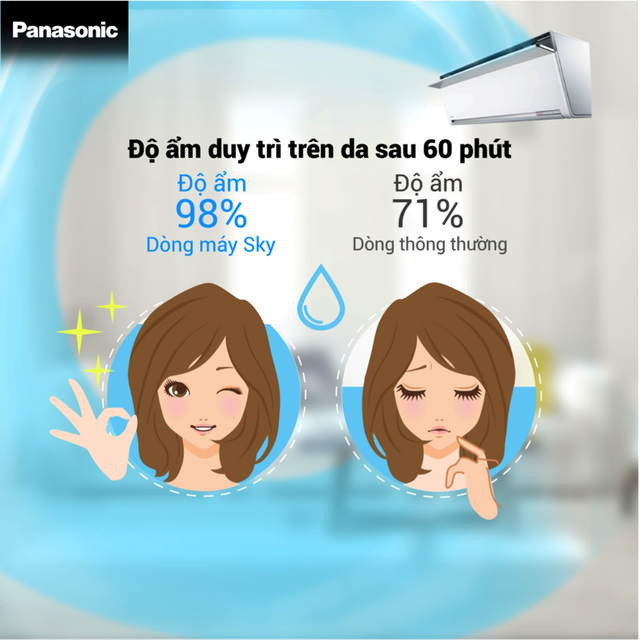 Thông thường, điều hòa sau thời gian sử dụng khoảng 1 giờ liên tục, sẽ khiến độ ẩm của phòng chỉ còn khoảng 68-71%, điều này gây khô da, và ảnh hưởng đến hệ hô hấp của người dùng đặc biệt là trẻ nhỏ, trẻ sơ sinh. Với điều hòa Panasonic Sky Series, sau 1 giờ sử dụng độ ẩm không khí vẫn giữ 98% giúp da bạn sẽ không bị khô và yên tâm trong từng giấc ngủ.